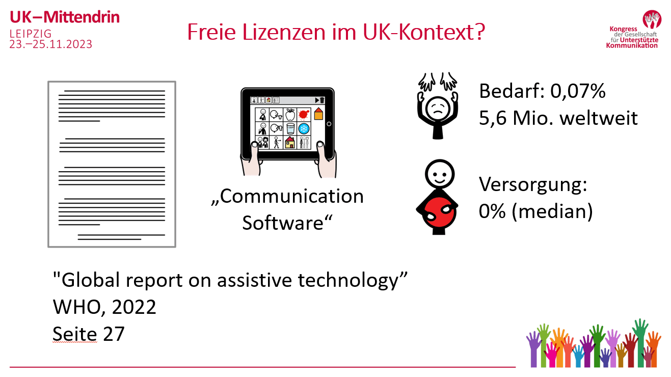 This can be viewed critically, as the right to communication is firmly anchored in the UN Convention on the Rights of Persons with Disabilities (CPRD) and thus existing resources for exercising (human) rights are withheld from a large group of people. The presentation therefore emphasized the importance of UK resources under free licenses. As a practical example, the free software for the UK AsTeRICS Grid” developed at UAS Technikum Wien in MA23-funded research projects was presented.
