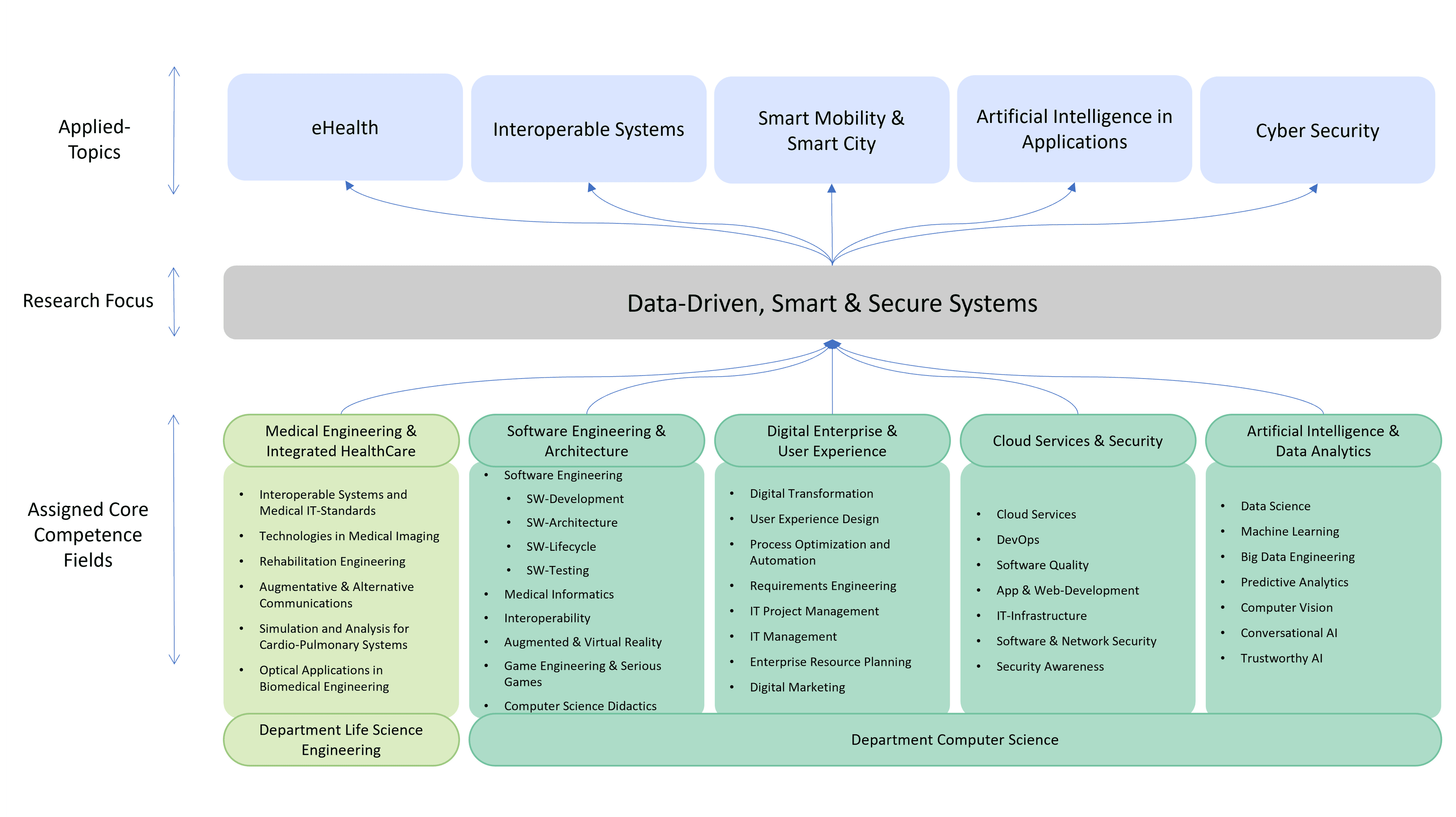 The interdisciplinary research focus “Data-Driven, Smart & Secure Systems” develops future-oriented concepts, technologies and services in the Lead-Topics “eHealth”, “Interoperable Systems”, “Smart City & Smart Mobility”, “Cyber Security” and “Artificial Intelligence in Applications” and makes them available for embedding in organizational and social ecosystems.