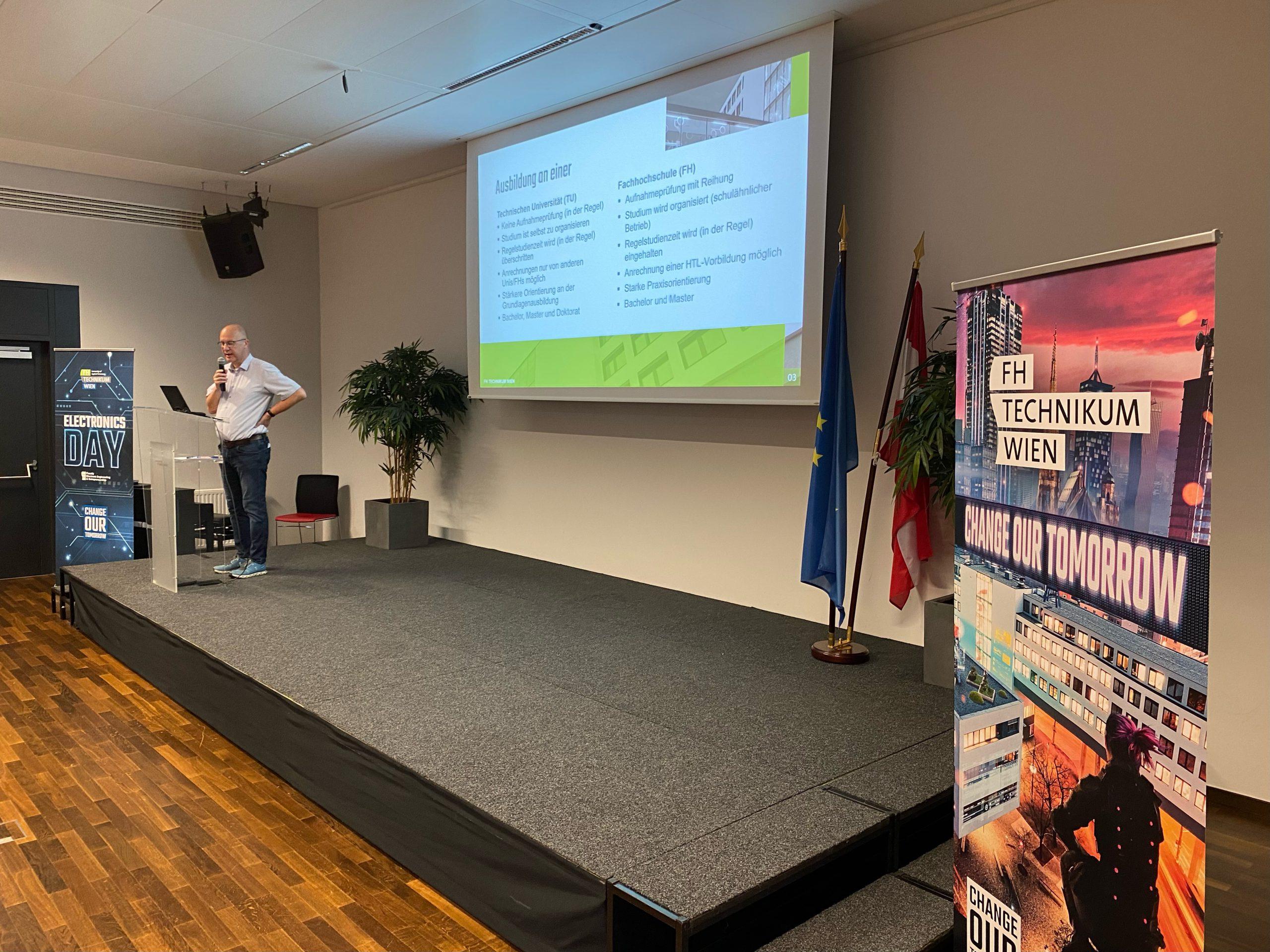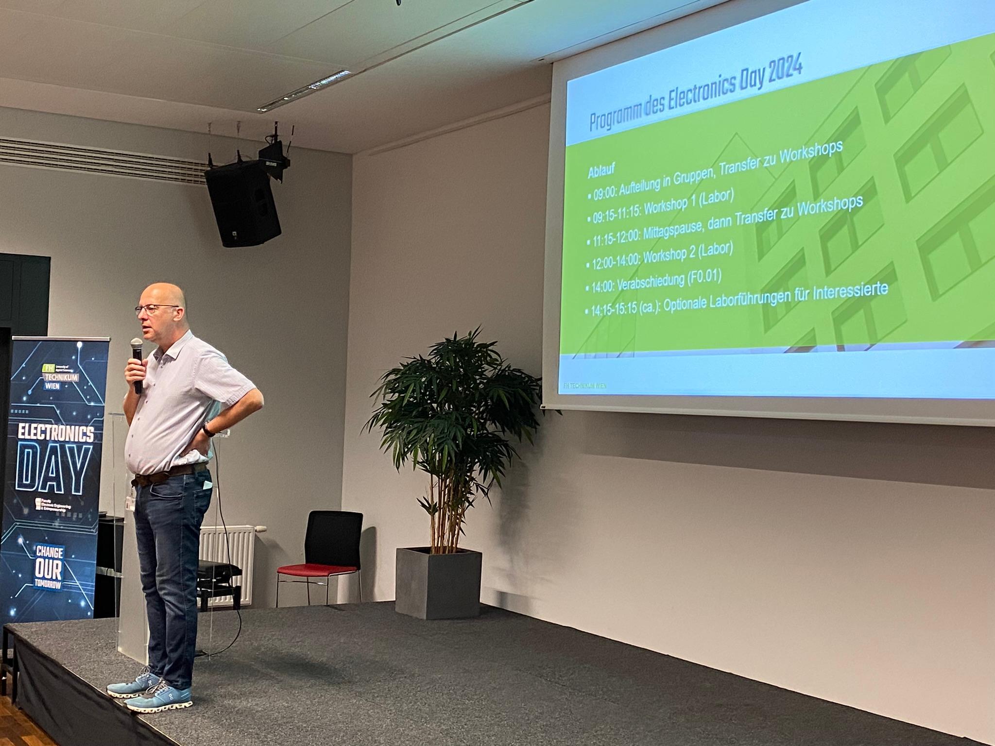 Wilfried Kubinger (Departmentleiter Electronic Engineering) war einer der Organisatoren des Events, er begrüßte die Schüler*innen und stellte die Vorteile eines Studiums an der FH Technikum Wien vor, insbesondere die starke Praxisorientierung und die modernen Laborausstattungen. Die Schüler*innen wurden anschließend in Gruppen aufgeteilt und starteten mit dem ersten Teil der Workshops. Dabei wurde den Jugendlichen die praxisnahe Ausbildung an der FH Technikum Wien nähergebracht.