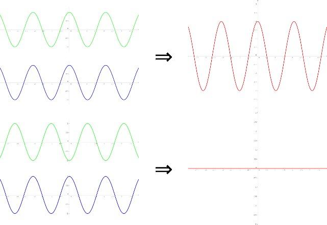 Links: Interferenz zweier Wellen – konstruktiv (oben) und destruktiv (unten). Rechts: Skizze eines Michelson Interferometers