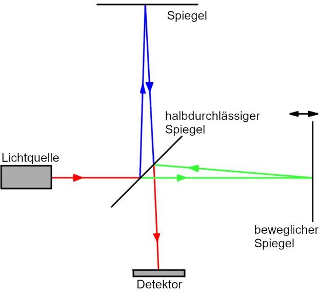 In einem Michelson-Interferometer trifft ein Lichtstrahl auf einen halbdurchlässigen Spiegel, welcher das Licht in zwei Strahlen aufteilt. Beide dieser Strahlen werden je an einem Spiegel reflektiert und treffen dann zusammen auf einen Detektor. Wird nun einer der Spiegel nach vorne oder hinten verschoben, ändert sich die Weglänge, die dessen Lichtstrahl zurücklegt, bevor er auf den Detektor trifft. Dadurch kommt es zu einer Phasenverschiebung zwischen den beiden Lichtwellen, was wiederum am Detektor zu konstruktiver oder destruktiver Interferenz führt. Die Lichtintensität, die vom Detektor gemessen wird, steht also im Zusammenhang mit den winzigen Verschiebungen des Spiegels.