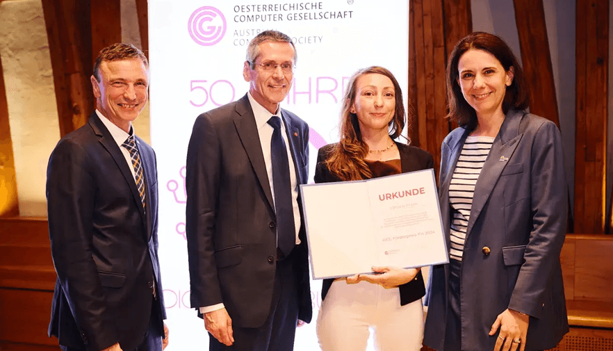 Seen in the title image: OCG Secretary General Ronald Bieber, OCG President Wilfried Seyruck, and Rector of the University of Applied Sciences Technikum Wien Sylvia Geyer presented the OCG Promotion Prize UAS 2024 to Viktoria Frank.