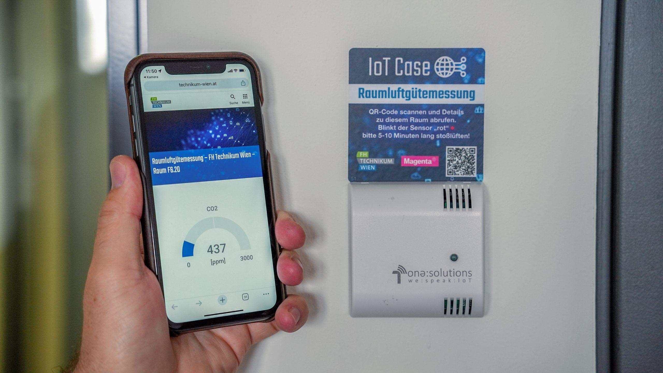 In the pictures below: Indoor air quality measurement at the UAS Technikum Wien, with sensor, app and diagram display.