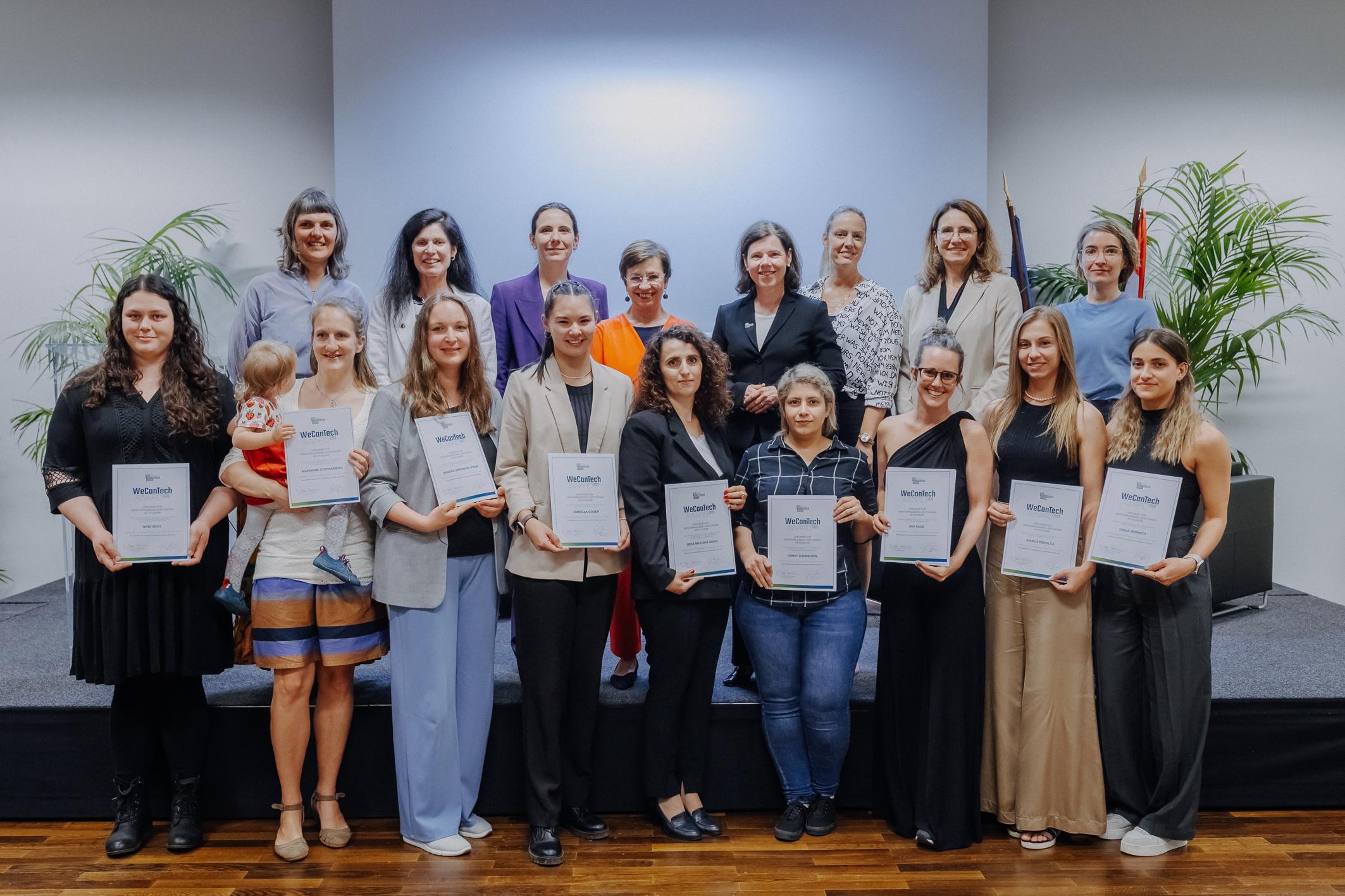 Image text: The winners of the WeCanTech Award 2024, together with the guests of honor and speakers, at the award ceremony at UAS Technikum Wien.