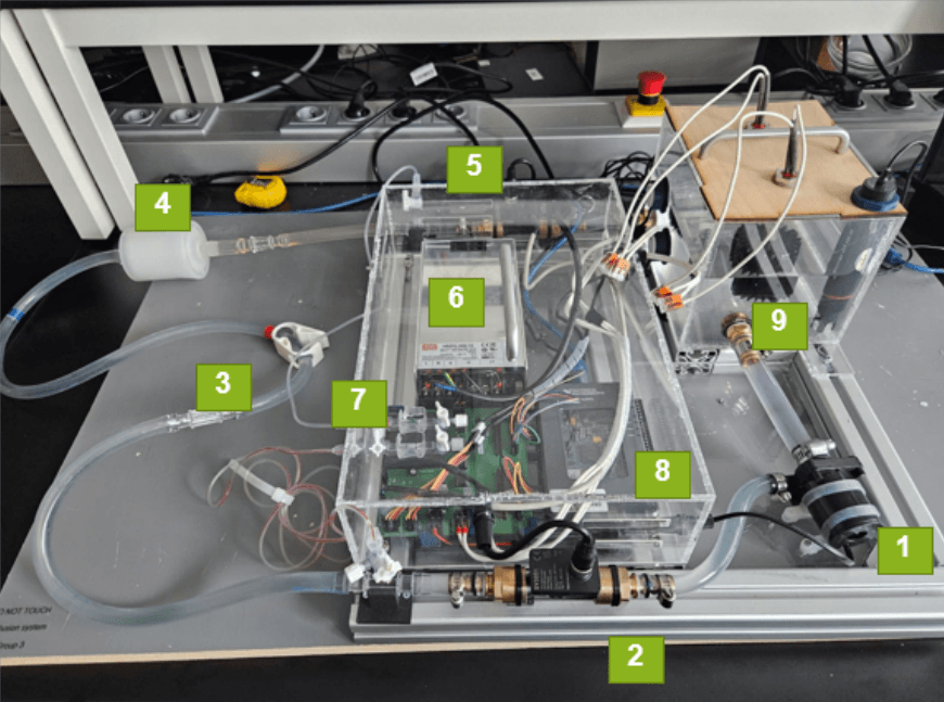 A simplified ex-vivo lung perfusion system consists of a centrifugal pump (1), two flow sensors (2,5), a clamp for simulating a resistance (3), a filter (4), a power supply (6), a PCB which includes all the electronics for signal adjustment and the two pressure sensors (7), the myRIO controller (8) and a reservoir including two level sensors, a pH sensor and the heating system (9).