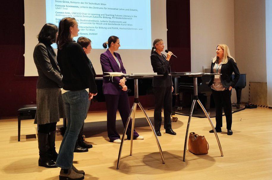 Weitere Teilnehmer*innen an der Diskussionsrunde waren Karoline Schermann, Leiterin des Zentrums für Innovative Lehre und Didaktik, UMIT Tirol, Carmen Sippl, Leiterin des Zentrums Zukünfte Bildung, PH Niederösterreich, Ester Tomasi-Fumics, Leiterin Studienrecht und Studienentwicklung, Universität für Musik und darstellende Kunst Wien und Daniela Klampfl, Sachbearbeiterin für Bildung und Politik, Hochschülerinnen- und Hochschülerschaft an der TU Wien. Moderiert wurde die Diskussion von Andrea Geisler (Bundesministerium für Bildung, Wissenschaft und Forschung – BMBWF).