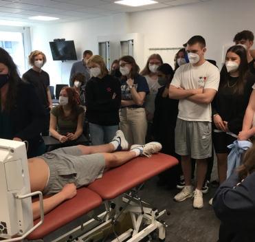 Ich sag es, wie es ist: Als wir diese Bezeichnungen das erste Mal gehört haben, wusste keiner von uns, was sie bedeuten. Wir wurden einfach outsmarted. Aber nach der anfänglichen „Lostheit“ waren wir sofort am Start, als es zu den Stationen ging. Das war wie Unterricht, aber so, dass man aufpassen will. Beispielsweise haben wir bei der Station von „Biomedical Engineering“ einen Wettbewerb darin veranstaltet, wer seinen Muskel stärker anspannen kann. Bei der Gesundheitstechnik gab es Geräte, die Lungen simuliert haben. Dort war unser Ziel eine künstliche Lunge zum Explodieren zu bringen (haben wir nebenbei bemerkt nicht geschafft). Auf der hauseigenen Intensivstation durften wir das Ultraschallgerät ausprobieren und haben festgestellt, dass es gar nicht so einfach ist, das gewünschte Objekt auf den Bildschirm zu bekommen.