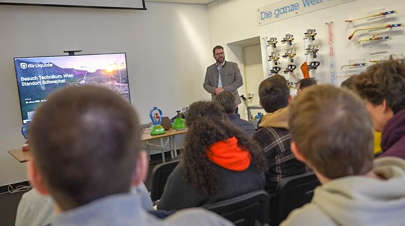Am 27. Januar 2025 machten sich Studierende der Studiengänge Bachelor Wasserstofftechnik (1. Semester) und Bachelor Maschinenbau (5. Semester im Wahlfach Verfahrenstechnik & angewandte Wasserstofftechnik) gemeinsam mit den Lehrenden Gerhard Fritscher, Christoph Steindl und Peter Muckenhuber (Studiengangsleiter Bachelor Wasserstofftechnik dual) auf den Weg zu OMV Raffinerie und Air Liquide in Schwechat und Wien Energie in Simmering. Ziel der Exkursion war es, aktuelle Entwicklungen und zukünftige Projekte im Bereich Wasserstofftechnologie kennenzulernen.