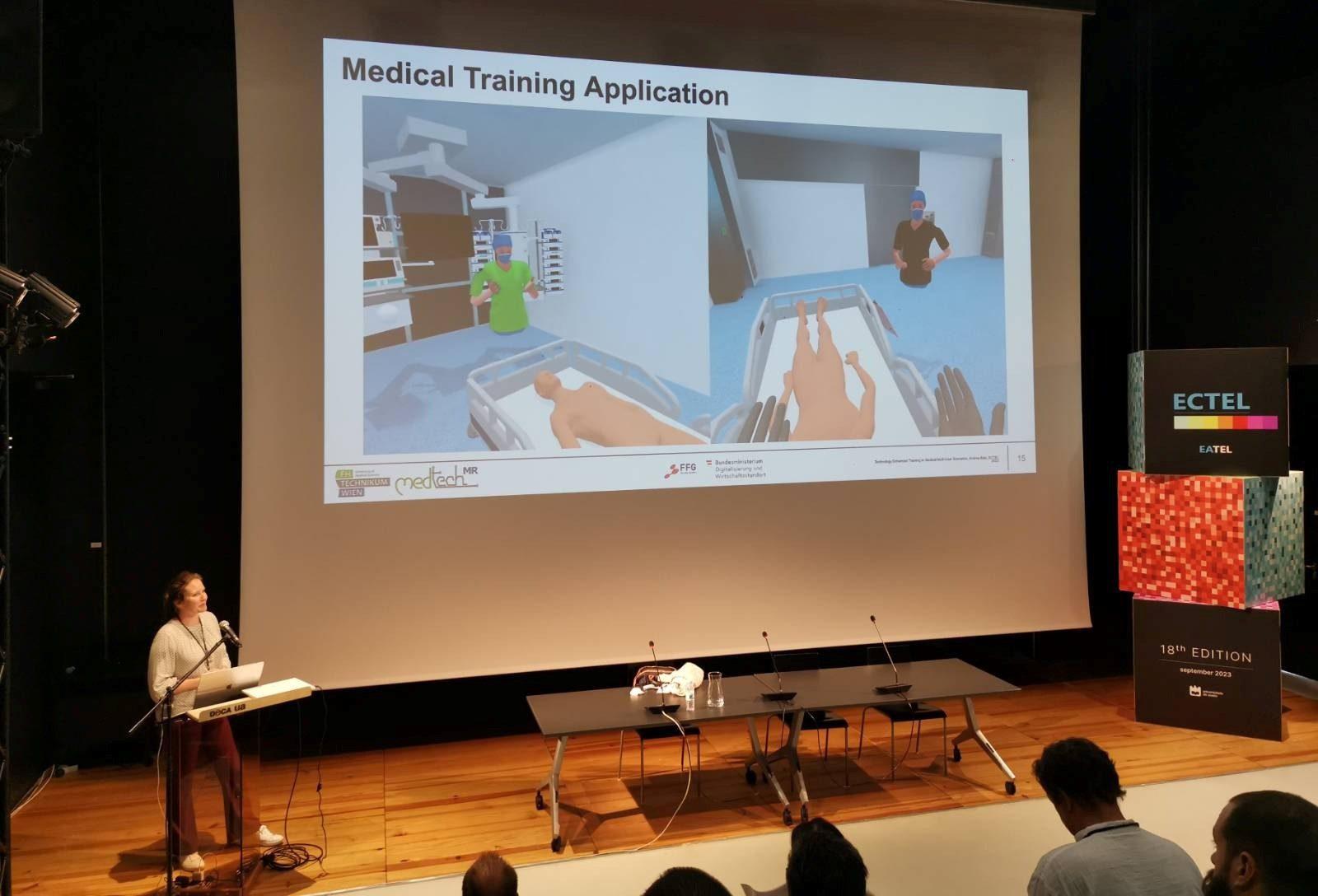 Andrea Balz (Kompetenzfeldleiterin Medical Engineering & Integrated Healthcare) hat mit September die Projektleitung von Mathias Forjan übernommen und bei der Konferenz die im Projekt entwickelten virtuellen Trainingsumgebungen für verschiedenste medizinische Szenarien präsentiert.