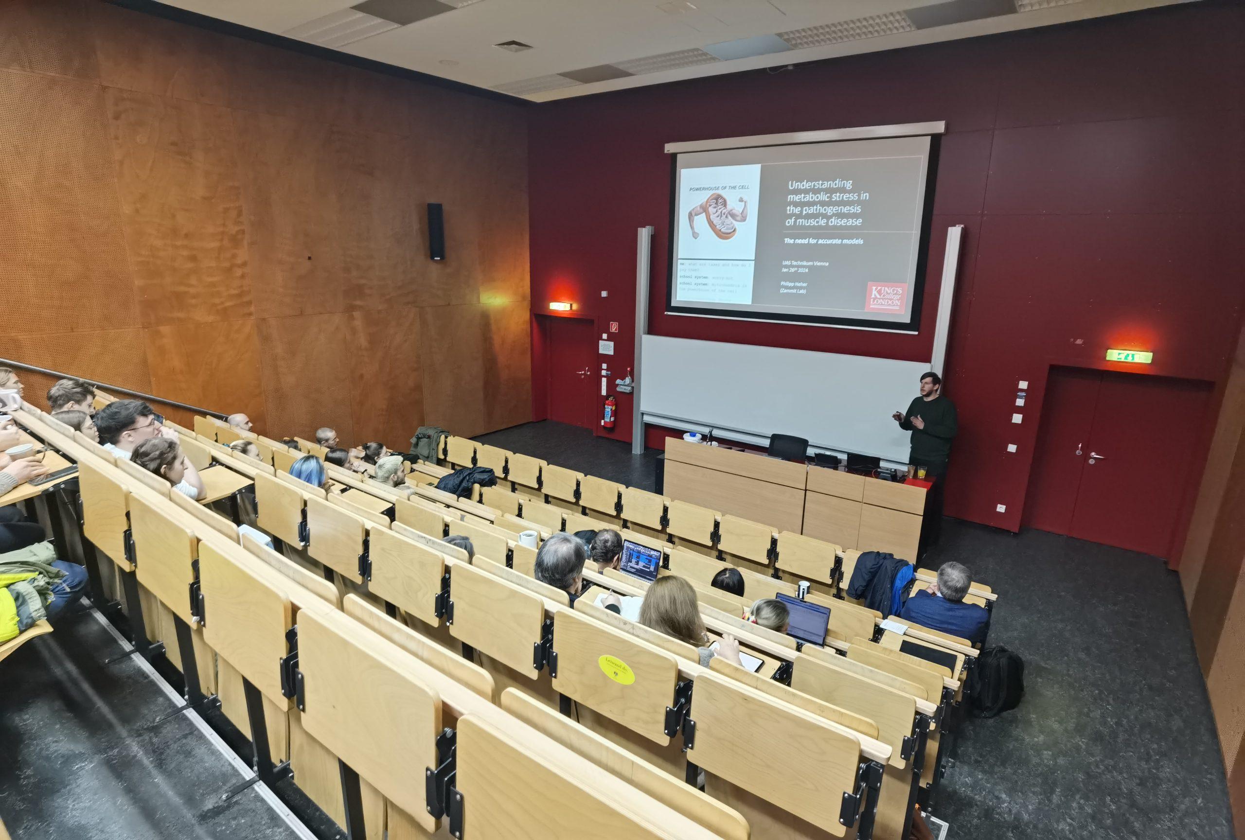 Dr. Philipp Heher vom King´s College London war am 26. Jänner an der FH Technikum Wien zu Gast und gab mit seinem Vortrag zum Thema “Understanding metabolic stress in the pathogenesis of muscle disease – the need for accurate models” einen interessanten Einblick in die Forschung von Muskelerkrankungen. Studierende des Bachelorstudiengangs Biomedical Engineering sowie des Masterstudiengangs Tissue Engineering and Regenerative Medicine nahmen an der Veranstaltung teil. Außerdem fand anschließend ein anregender Austausch mit Forscher*innen der Fakultät Life Science Engineering statt.
