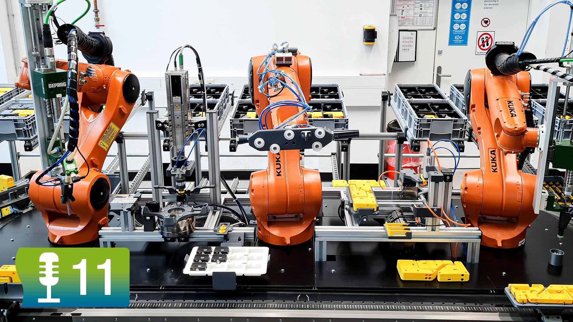 Roboter fertigen Roboter: Ali Aburaia, Leiter der Digitalen Fabrik, erläutert in der neuen Podcast-Folge, wie in der Pilotfabrik der FH Technikum Wien eine flexible, vollautomatisierte Produktion nach dem Konzept des Lights Out Manufacturing umgesetzt wird.