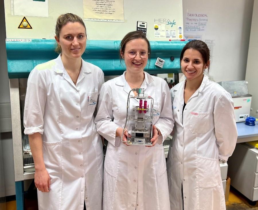 Auf Bild 2, (Titelbild, ganz oben): Mitglieder der Forschungsgruppe mit dem MagneTissue-Bioreaktor. Links: Dorota Szwarc-Hofbauer (Leiterin des Kompetenzteams Genombearbeitung der Stadt Wien, MA23 # 35-07), Mitte: Marguerite Meeremans, rechts: Carina Hromada (Mitglied des Forschungsprojekts ImmunTissue der Stadt Wien, MA23 # 30-11)