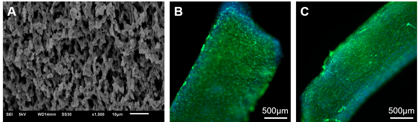Auf Bild 1: Mechanische Stimulation von in Fibrin-Hydrogelen eingebetteten Zellen unter Verwendung des MagneTissue-Bioreaktors. (A) Rasterelektronenmikroskopische Aufnahme von Fibrin; (B, C) ActinGreen-DAPI-Färbung (grün/blau) von in Fibrin kultivierten Pferdesehnenzellen, die die Zellmorphologie bzw. den Zellkern darstellen. Im Gegensatz zur unbelasteten Kontrolle (B) verlängerten sich die Zellen nach 7 Tagen im MagneTissue-Bioreaktor parallel zur Richtung der angelegten Belastung (C).